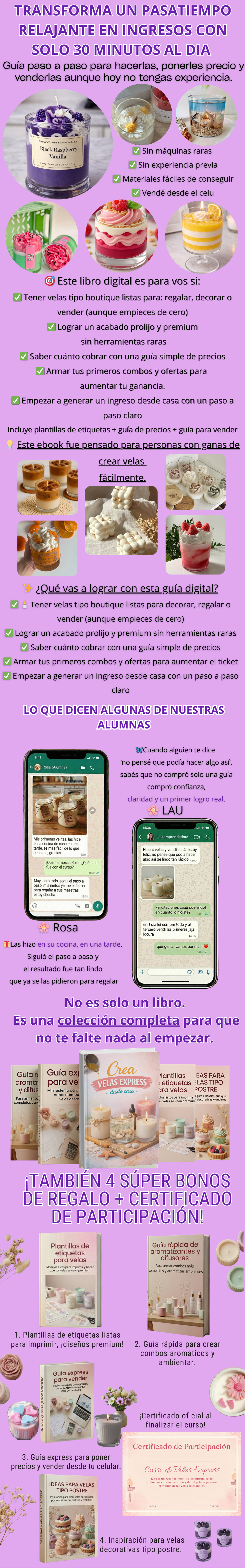 No es solo recetas. Incluye una guía express para poner precios, armar packs, presentar tus velas como algo premium y ofrecerlas desde el celu sin sentir que molestás.